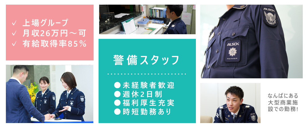 | 仕事内容 | 大阪エリアでの警備業務を中心にお任せします。※適性に応じて人員管理などの人事関連業務もお任せ |
