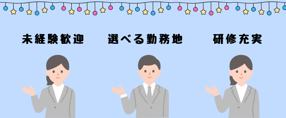 | 勤務地 | 最寄り駅から徒歩圏内の店舗多数!※ご希望の勤務地をお選びいただけます。 |