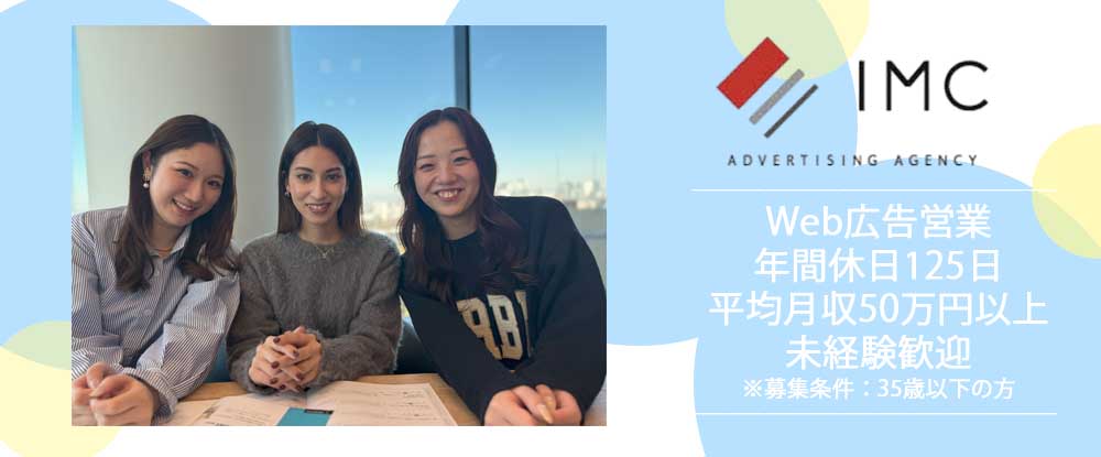 「営業はハードそう…」 ――そう感じている方こそ、IMCで新しい一歩を。 当社はWeb広告を通じて、企業の“集客・採用課題”を解決しています。 未経験からスタートした社員が、今では企業の成長を支え...