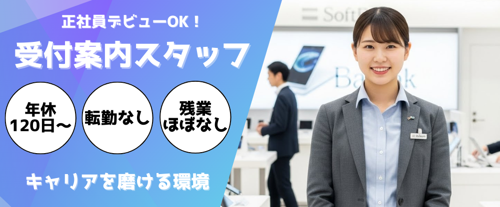 | 仕事内容 | 【個人ノルマなし】 ソフトバンクショップでの受付・接客(スマホや通信サービスのご案内、各種手続き等) |
