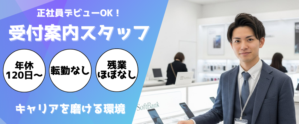 | 仕事内容 | 【個人ノルマなし】 ソフトバンクショップでの受付・接客(スマホや通信サービスのご案内、各種手続き等) |