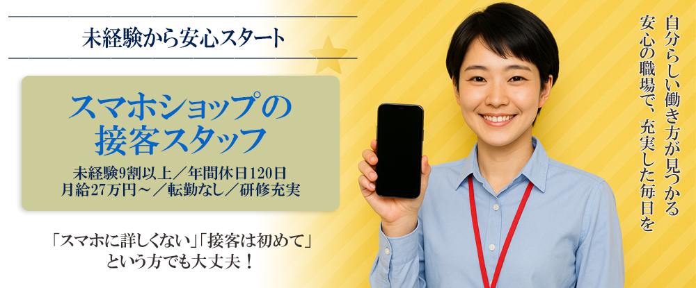 | 仕事内容 | 未経験歓迎のスマホ販売スタッフのお仕事です。接客や事務手続きを通じて、お客様に最適なプランを提案! |