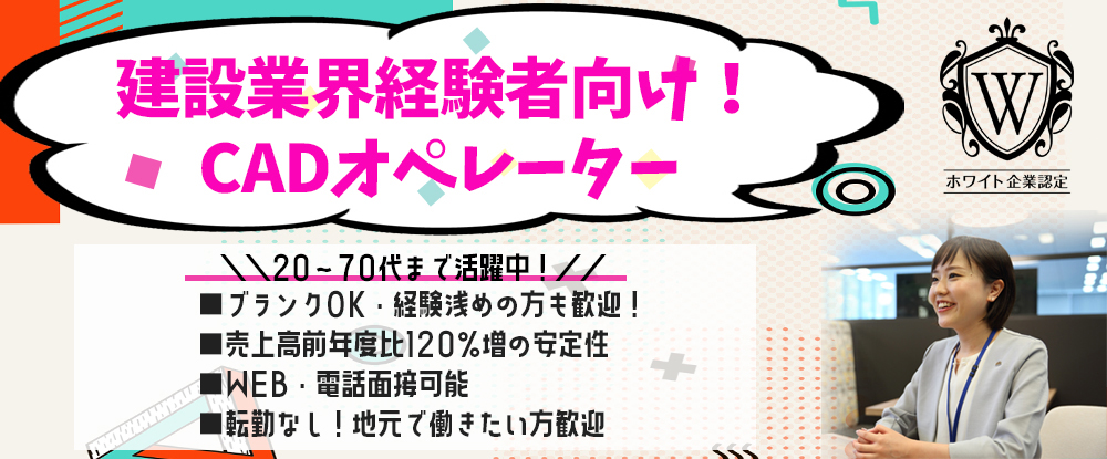 CADオペレーター◆収入20%UP確約/面接1回/転勤なし/月給45万円以上/建設業界経験を活かす◆