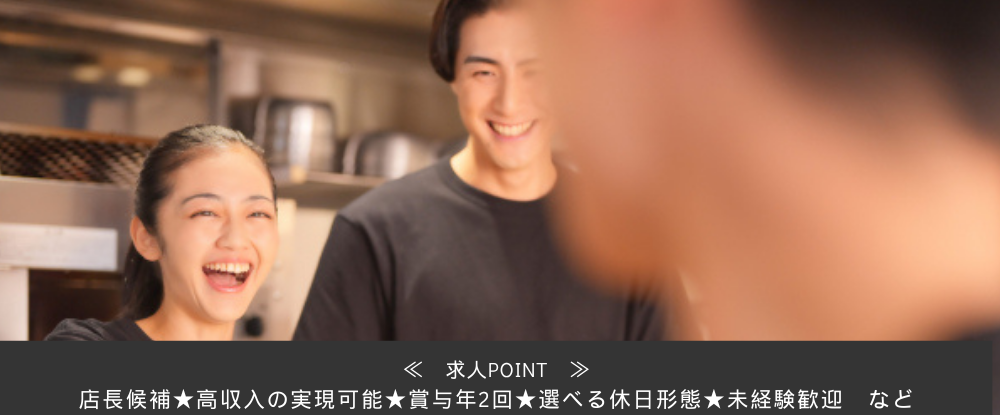 未経験から店長・マネージャーへ!自由度の高いシフト(完全週休2日)高収入で飲食業界に挑戦しませんか?