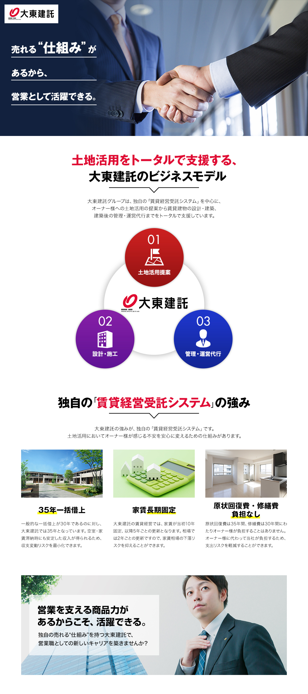 ●未経験でOK!新しいスタートを切りませんか?● …………………………………………………………… #中途入社の9割が未経験スタート。  飲食、アパレル、美容師など「人と話すのが好き」な先輩が活躍中。  転職後に初めてスーツを着た人も! #3カ月のOJT+課長・支店長の同行フォローあり。  商談も提案も安心。  税務・建築の知識も専門家と連携して学べます #担当エリアはチームで地図を共有し交代で回る独自スタイル  相性の良いお客様と出会いやすく、個性を武器にできます  一括借上システムがあるから、お客様の経営もあなたの挑戦も支える土台は万全! ●そして、成果は正当に還元● …………………………………… ■入社7ヶ月以内の初契約で新人賞50万円 ■高額歩合+賞与年2回で年収1000万円超も現実的(平均年収917万円) フレックス&年休125日、勤務地も全国から希望考慮。 マメさと誠実さで信頼を積み重ね、収入もやりがいも手に入れませんか?