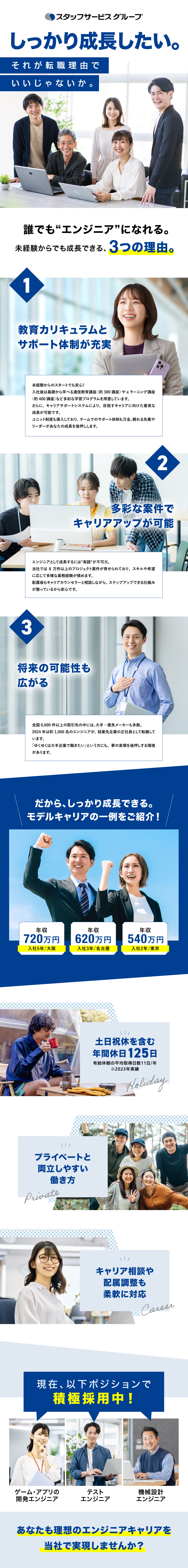 スタッフサービス・エンジニアリングでは、 成長と安心を全力でサポートします。 未経験からスタートする方も安心して働けるよう、 充実した支援体制を整えています。 ━━全力のサポート体制━━ 【充実し...