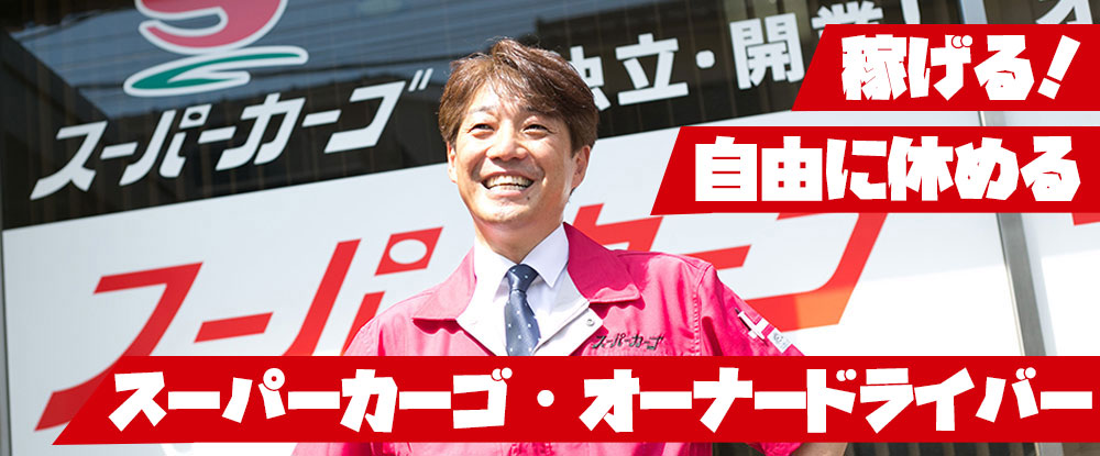 「自由に働きたい」 「正社員ではなく、オーナーとして稼いでいきたい」 そんな方にはスーパーカーゴの協力業者がお勧めです。 空いている時間や曜日を活用しての兼業でも、フルタイムで稼働し専業として稼ぐもよし! 現在車両をお持ちでない方も是非ご相談下さい。 スーパーカーゴのスポットチャーター便は、あなたの希望にフレキシブルにお応え可能です! >>当社について<< 50年を超える歴史があり、全国に8万社以上の取引先があります。 また当社の特徴として通常の宅配やネット通販と違い、 時間や地域の縛りやノルマの無い企業間配送の「スポット便」に特化しています! 車1台で稼げる環境は、全国ネットワークがあるからこそ! 協力業者の皆さんには、より多くのビジネスチャンスをご提供させて頂く事で 事業の多様化や自由な稼働スケジュールを可能にしています。 >>未経験者もちろん歓迎!!<< 同業者の方も他業者の方も、 もちろん未経験からの脱サラ希望の方も大歓迎です! 一緒にオーナーとして頑張っていきましょう!!
