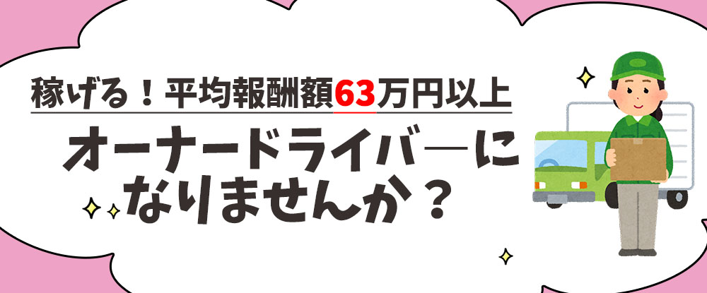★とにかく稼ぎたい ★勤務時間や固定休み、職場の人間関係に縛られたくない ★副業と両立したい ★運転が好き ★子育て、介護の時間を作りたい そんなサラリーマンや働く人ならでは実現困難な事も、 自営業なら可能です♪ 休むのも、働くのもあなたのペースでOK! フルタイムで稼働して、ガッツリ専業として稼ぐもよし! 普通免許と運転経験があればOK! 現在車両をお持ちでない方も是非ご相談下さいね。 ■<当社について> 50年を超える歴史があり、全国に8万社以上の取引先があります。 また当社の特徴として通常の宅配やネット通販と違い、 時間や地域の縛りやノルマの無い企業間配送の「スポット便」に特化しています! 車1台で稼げる環境は、全国ネットワークがあるからこそ! 配送した先でまた仕事があるので、効率よく稼ぐことができるんです! 協力業者の皆さんには、より多くのビジネスチャンスをご提供させて頂く事で 事業の多様化や自由な稼働スケジュールを可能にしています。 ■<自営業だけど、一人じゃないのが嬉しい所> 未経験者もちろん歓迎!! 同じ看板でやってるから横の繋がりもたくさんいて 相談やサポートができますよ! 同業者の方も他業者の方も、 もちろん未経験からの脱サラ希望の方も大歓迎です! 一緒にオーナーとして頑張っていきましょう!!