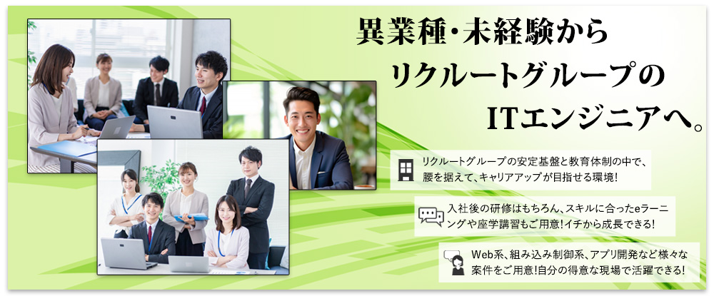 >>入社までの選考プロセス<< 〈1〉書類選考 〈2〉面接+筆記試験(適性検査) 〈3〉内定 応募から「1ヶ月以内」で入社することも可能です☆彡 ▼▼▼未経験でも安心の研修制度 ・・・・・・・・・・・・・・・・・・・・・・・・・・・・・・・・・・・・・・・ ITの知識や技術がなくてもご安心を! まずはキャリアサポート担当が、 あなたの希望や将来のキャリアについてじっくり面談をします。 またスキルアップのために 「通信教育制度」「資格取得支援制度」 など、あなたが望む方向に進めるサポート制度を多数ご用意しております! ▼▼▼豊富な案件から最適な案件へアサイン ・・・・・・・・・・・・・・・・・・・・・・・・・・・・・・・・・・・・・・・ 自分の成長を実感しながら、 プロジェクトに携わることが可能。 また職場環境もあなたが働きやすいように キャリアサポート担当が徹底的にサポートします! ▼▼▼リクルートGならではの好待遇をご用意 ・・・・・・・・・・・・・・・・・・・・・・・・・・・・・・・・・・・・・・・ ★賞与年2回(賞与3.2ヶ月分) ★残業時間月平均12時間程(前年度実績) ★年間休日120日+原則土日祝休み ★社員寮・住宅手当制度あり、等