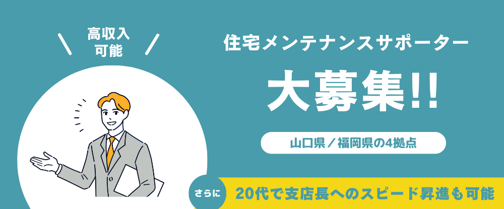\ 若いうちに“役職”も“高収入”も狙える環境 / 拠点拡大中だからこそ、チャンスが広がっています。 ◆【4拠点同時募集&今後もエリア拡大予定】 現在は《北九州・福岡市・山口県・久留米市》の4拠点で積極採用中。さらに今後も新拠点を順次開設予定のため、ポジションが続々と誕生しています。空きポストが多い今は、昇格を目指す絶好のタイミングです。 ◆【若くして管理職へ。実力次第でスピード昇格】 年齢や社歴ではなく、評価基準はあくまで成果。実績を積み上げれば、早期にリーダーや拠点長などの管理職を目指せます。実際に25歳の若き支店長が今も活躍しています。若いうちから責任あるポジションに就きたい」「とにかく稼ぎたい」そんな成長意欲の高い方に最適な環境です。 ◆【転勤なし。地域に根差してキャリア形成】 配属は希望エリアを考慮し、転居を伴う転勤はありません。それぞれの地域で腰を据えて働けるため、地元で長期的なキャリアを築きたい方にも安心です。 ◆【専門知識ゼロからスタート可能】 リフォームや建築に関する知識は一切不問。業界未経験でも問題ありません。必要な知識は入社後に身につけられるため、「営業に挑戦したい」という気持ちがあれば十分です。 ――拡大フェーズの今だからこそ、ポストもチャンスも豊富。 成長企業で、自分の可能性を一気に広げてみませんか。