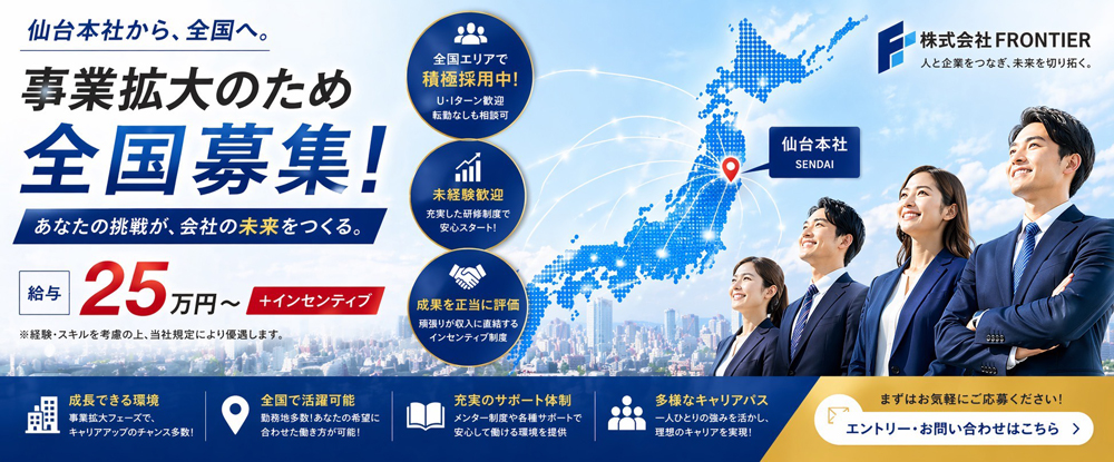 ■社内ベンチャーを“本気”で後押し■ 株式会社FRONTIERは、若者の起業や独立を強く推奨する企業です。 「何から始めたらいいかわからない」 「思うように事業設計ができない」 「資金が足りない」 ...