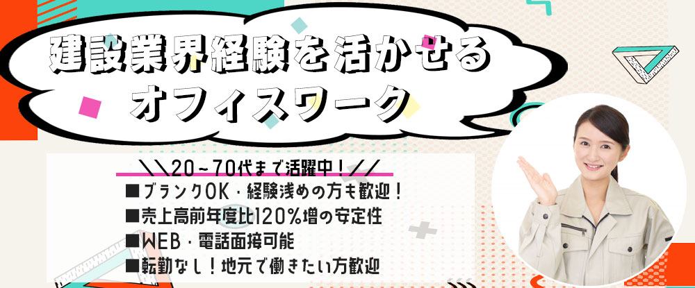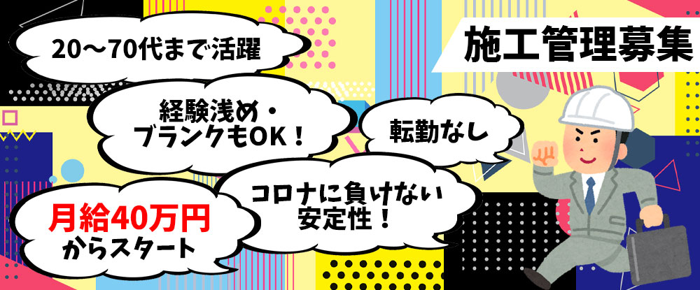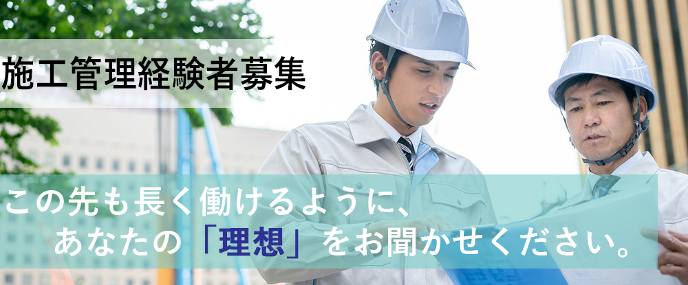 「生涯現役で活躍したい」そんな経験者に選ばれている当社。 今回も幅広い年代を視野に入れ、施工管理経験者を募集いたします。 ▼東証プライム・名証プレミア上場企業グループ▼  ̄ ̄ ̄ ̄ ̄ ̄ ̄ ̄ ̄ ̄ ̄ ̄ ̄...
