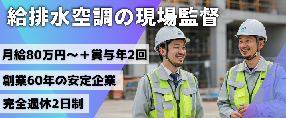 | 仕事内容 | 給排水設備、空調、冷暖房工事の施工管理をお任せ!経験に応じて担当領域を決定します。 |