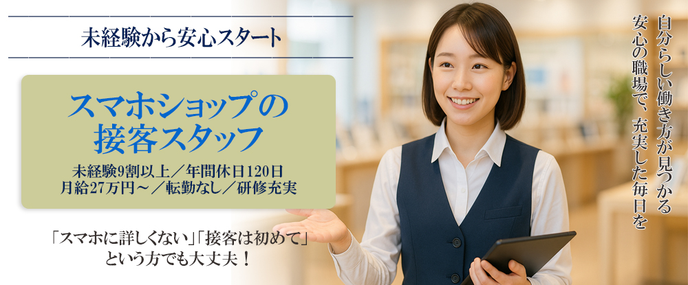 ■未経験から安心してスタートできる研修体制■ 当社では、人柄を重視した採用を行っています。 入社後は2週間の基礎研修からスタートし、 スマホや通信サービスの知識、接客の基本をしっかり学べます。 本部...
