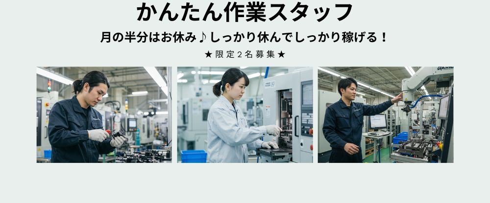 | 仕事内容 | 商品の加工や組み立てなど、製造の一部工程をお任せします。 コツコツと、丁寧に進めることが得意な方は必見! もくもく作業が好きな方にもおすすめです♪ 【具体的なお仕事例】 ・紙袋機械オペレーター・検... |