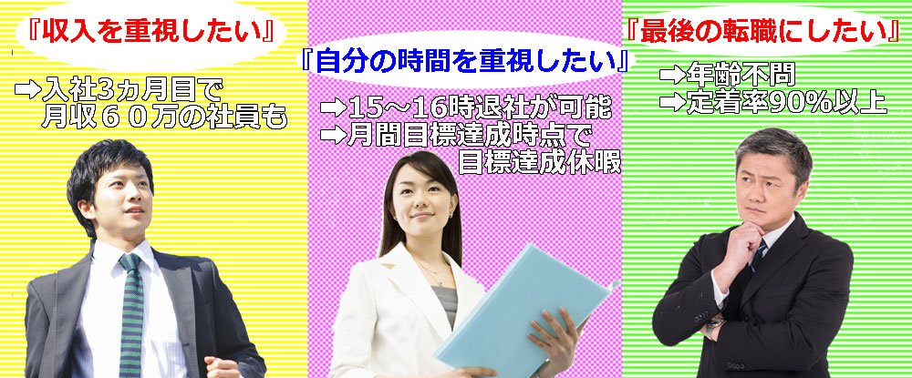 …●安心してスタートが切れる… 当社は新たなスタートを切るあなたを全力で支援。 安心して営業スキルを磨くことができる環境で、 プレッシャーなく仕事に取り組めます。 努力次第でさらに収入アップが見込...