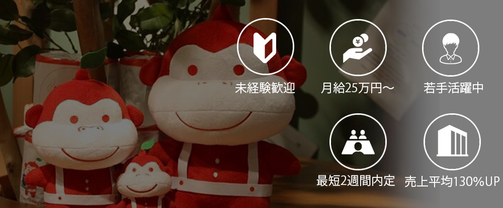 | 給与 | 月給25万円~ ※年齢・経験・スキルを考慮の上、当社規定により優遇します。 ※固定残業代(55,8... |