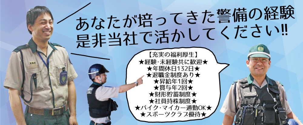 | 仕事内容 | 大阪エリアでの警備業務を中心にお任せします。※適性に応じて人員管理などの人事関連業務もお任せ |