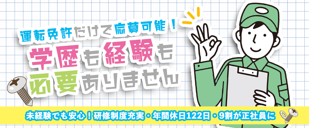 ■安心のトレーニング制度■ 当社では教育制度に力を入れており、 座学とOJTを通じて約3週間で一人前になることができます。 早い方であれば、2週間で独り立ちすることも可能です。 独り立ちした後も、先...
