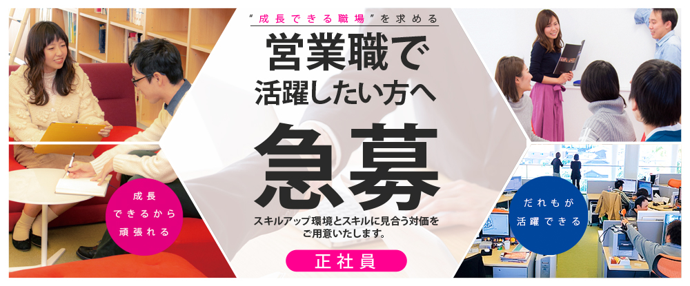 全員が未経験!営業初心者に選ばれやすい理由とは? 「将来のことを考えて、営業にチャレンジしたい」と考えている方こそ、当社にぜひお越しください。実際、先輩たちはみんな経験ゼロから一人前の営業になってい...