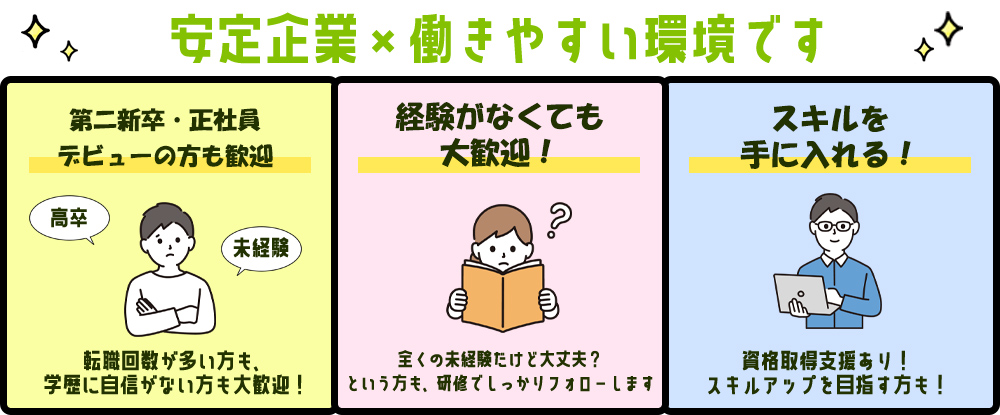 \ 未経験から月給28万円以上! / 安定基盤のもとで研修充実、キャリアも収入も伸ばせる環境です。