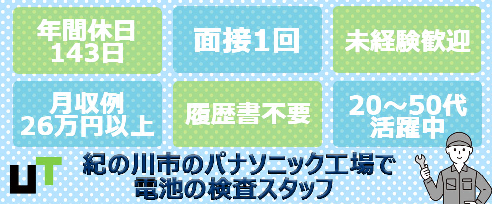 ~~パナソニック工場のお仕事です~~ テスラ等電気自動車に使われているリチウムイオン電池の製造工程をお任せします。 〈●今までの経験は一切不問〉 未経験で入社した方が多く、研修が充実。 安心してお...