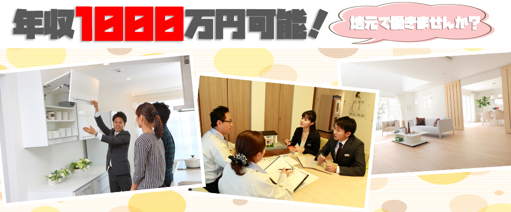 | 仕事内容 | 展示場へ来られたお客様への反響営業です。 飛び込み訪問や外回りなどの業務はありません。 具体的に検討したいというお客様には理想の家のイメージやご要望をヒアリングし、プランを作成します。 ご契約後はプ... |