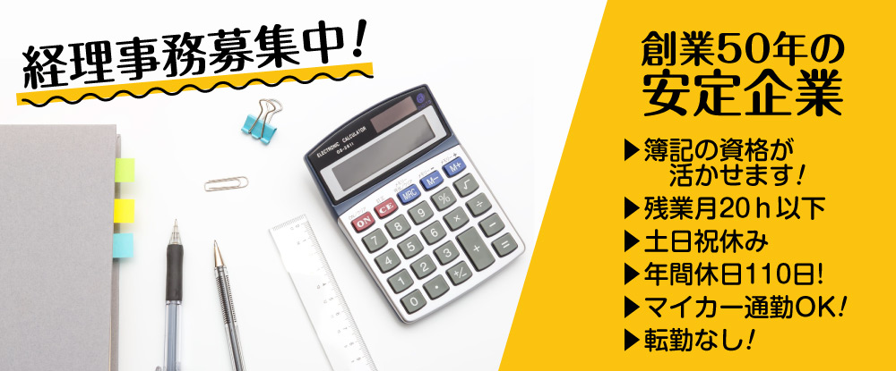 | 仕事内容 | 【創業61年の歴史ある専門メーカー】総務業務全般の管理・運営◎本社勤務/転勤なし/マイカー通勤OK! |