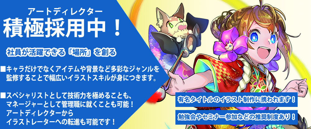 | 仕事内容 | デザイン制作及びゲーム企画制作のプロジェクトマネージャー業務を担当いただきます。 ・プロジェクトの予算策定、予実管理業務 ・スケジュール管理や人員調整等、プロジェクトの進行に関わる各種業務 ・イ... |