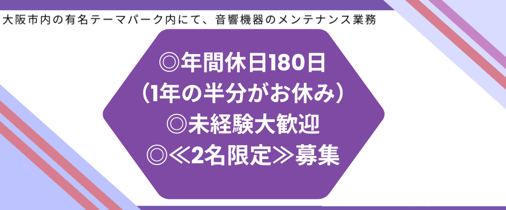 《テーマパーク勤務》未経験からスキルアップ★ ~~~~~~~~~~~~~~~~~~~~~~ 当社は、テーマパークでお客様にお楽しみ頂く為、 映像や音響の側面でお手伝いをさせて頂いております。 そん...