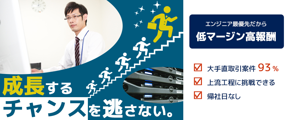 | 仕事内容 | 当社が最も大切にする「人財」を育て,評価する仕組みが整っています。 ■当社を支えるエンジニアの成長を第一に考え,一人一人のレベルに合わせたカリキュラムを用意。 専任講師がつき,質問には丸一日以内に... |