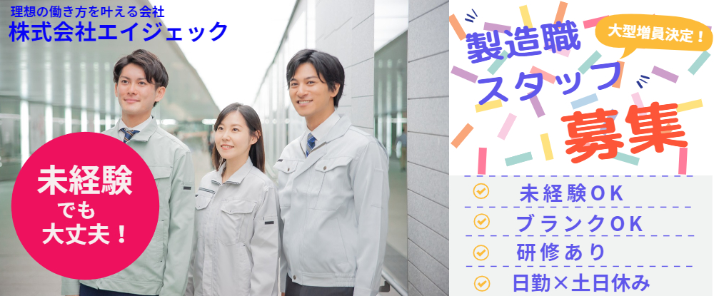 「「完全未経験でも働きやすい会社に転職したい方にピッタリ!」」 安心のサポート体制で完全未経験から、 モノづくりにかかわる正社員として活躍できるのが当社の特徴。 「馴染みのある地域・働きやすい職場...