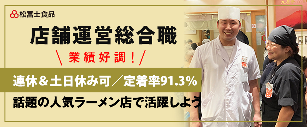 “ラーメン”を通して、人を笑顔にする仕事 未経験からキャリアも収入も育つ 「いらっしゃいませ!」 湯気の立ちのぼるカウンターの向こうで、 お客様が笑顔になる瞬間―― その景色をつくるのが、松富士食...