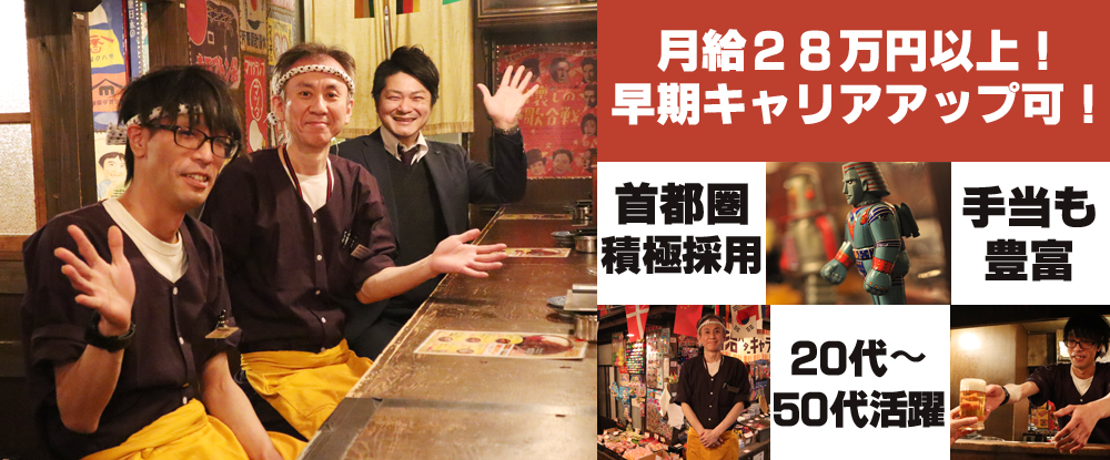 人気居酒屋の店舗スタッフ◆店長候補/月給28万円以上/賞与年2回/未経験者歓迎/完全週休2日◆