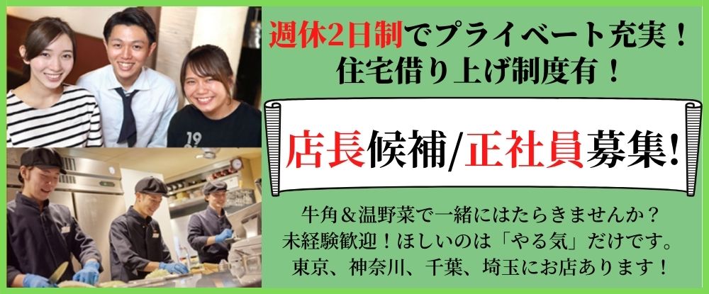 飲食経験を最大限に活かせる!店長候補としてキャリアアップ&月給35万円~+完全週休2日の安定環境