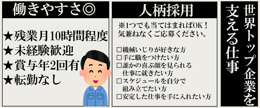 | 仕事内容 | 機械のメンテナンスや動作確認作業 |