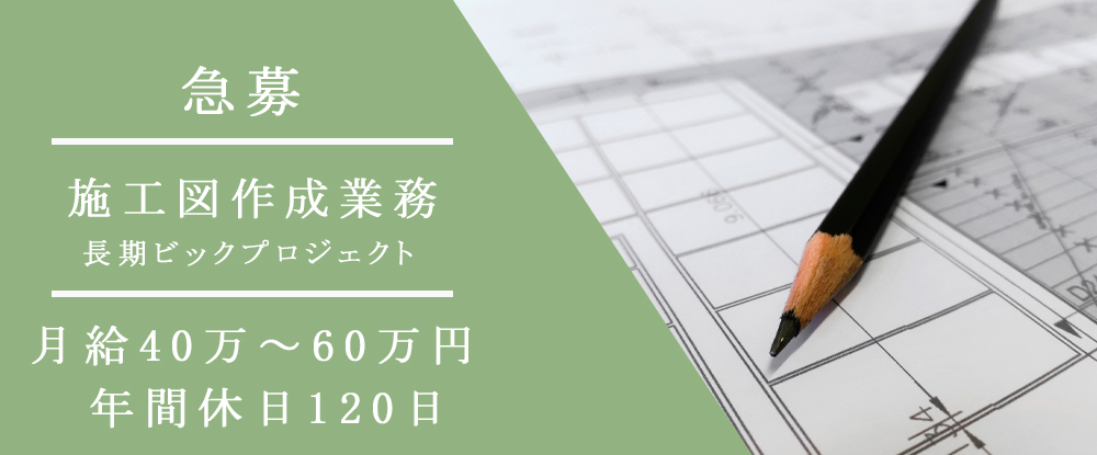 | 仕事内容 | 大手建設会社のプロジェクト先にて、施工管理・作図業務をお任せします。 |