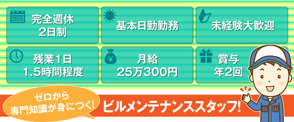 ビルメンテナンス◆未経験歓迎/正社員/転勤なし/最大年間休日130日/福利厚生充実/資格手当あり