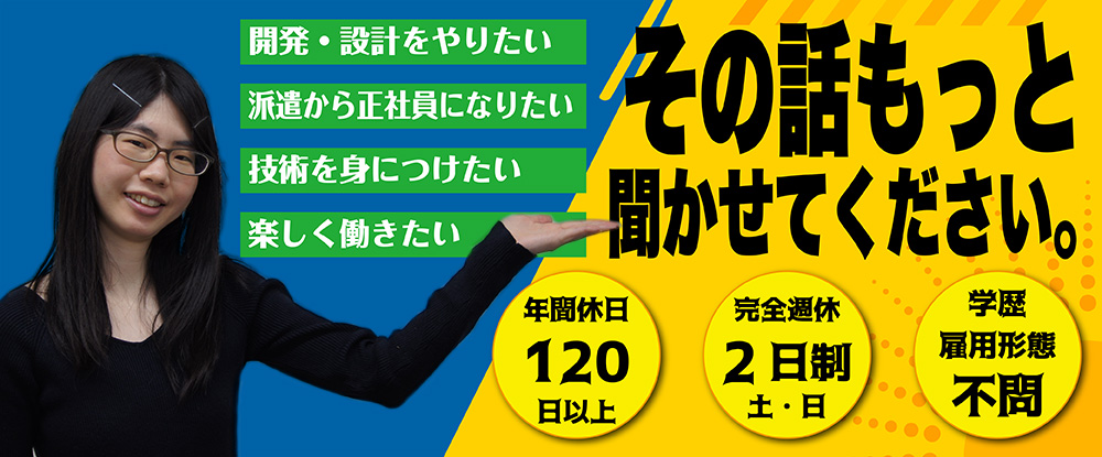 | 仕事内容 | 「エンジニアって難しそう…?」ご安心ください!未経験の方でも活躍されている方多数! |