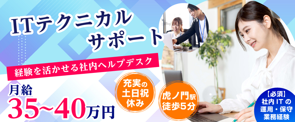 ヘルプデスクや、PCキッティング、アカウント管理、 ドキュメント作成など、IT事務・サポートのお仕事の経験がある方必見! 経験の浅い方でも、簡単なIT事務・サポート業務からIT業界で活躍することがで...