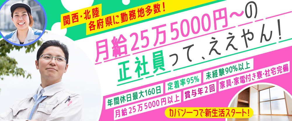 | 給与 | ■月給25万円~ ※経験・年齢を考慮の上、当社規定により優遇します。 |