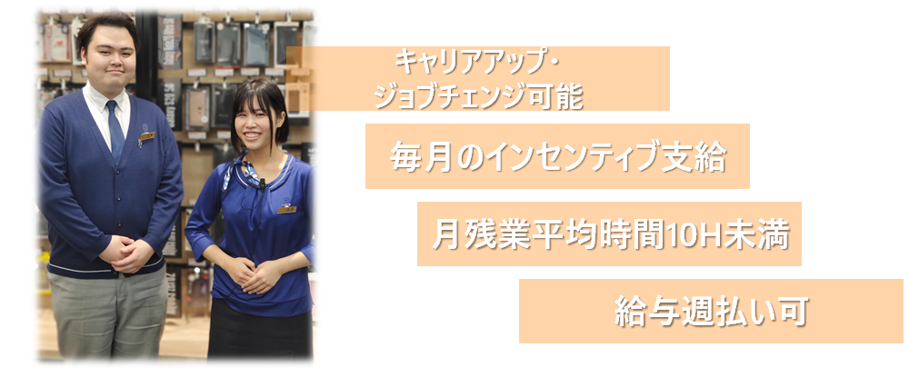 | 仕事内容 | 未経験歓迎のスマホ販売スタッフのお仕事です。接客や事務手続きを通じて、お客様に最適なプランを提案! |