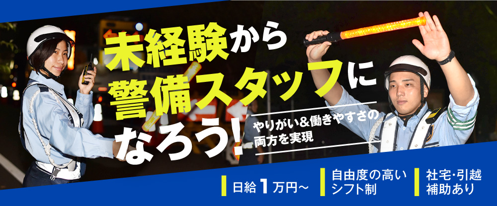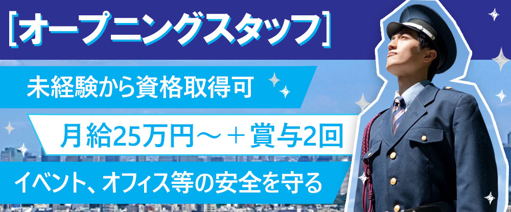 | 仕事内容 | イベントや施設の警備スタッフ★現場で経験を積んでいただき、徐々に管理職としての業務をお任せします! |