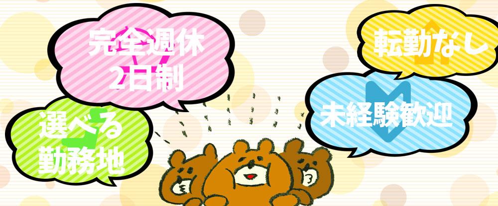 | 勤務地 | ■東京都(渋谷・錦糸町・吉祥寺)、神奈川県(新横浜・藤沢)、千葉県(柏)、埼玉県(南浦和)に勤務地有 |