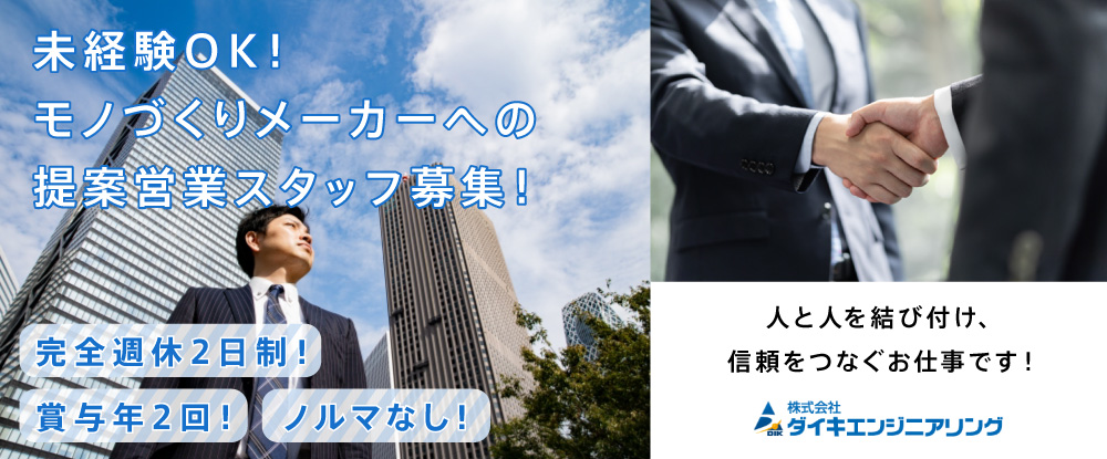 | 仕事内容 | 建設業界の企業から案件を獲得し当社の技術者を各企業様へと紹介する、『仕事』と『人材』をマッチングさせる仕事です。 双方に喜んでもらえるよう、クライアントと技術者の両方とコミュニケーションします。 ... |