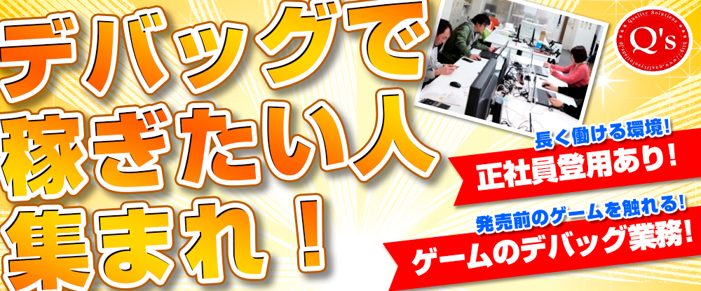 | 仕事内容 | 「周囲とともに成長ができる」「QAマネージャを目指す」「QA知見を広げる」「自社開発のQA」 ゲームプロダクトのデバック計画の立案および推進のサポート業務を行っていただきます。 管理面含めQAに関わ... |