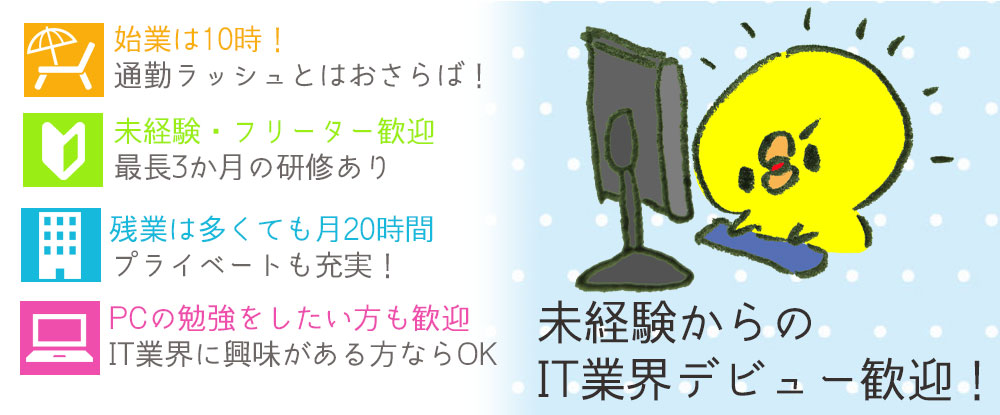 | 仕事内容 | 「エンジニアって難しそう…?」ご安心ください!未経験の方でも活躍されている方多数! |