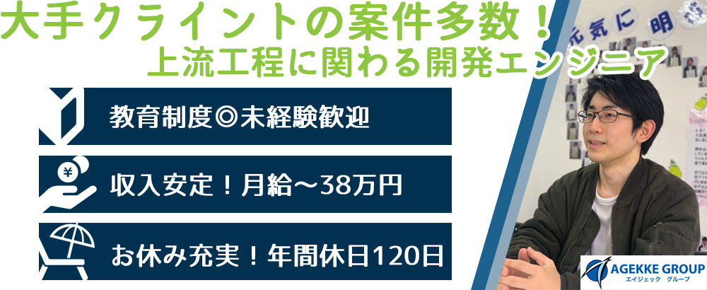 ■未経験からエンジニアのプロへ!■ ――――――――――――――――――― あなたの新しいチャレンジを応援します! 当社では、プログラミングの基礎から実践的なスキルまで学べる 充実した研修制度を...