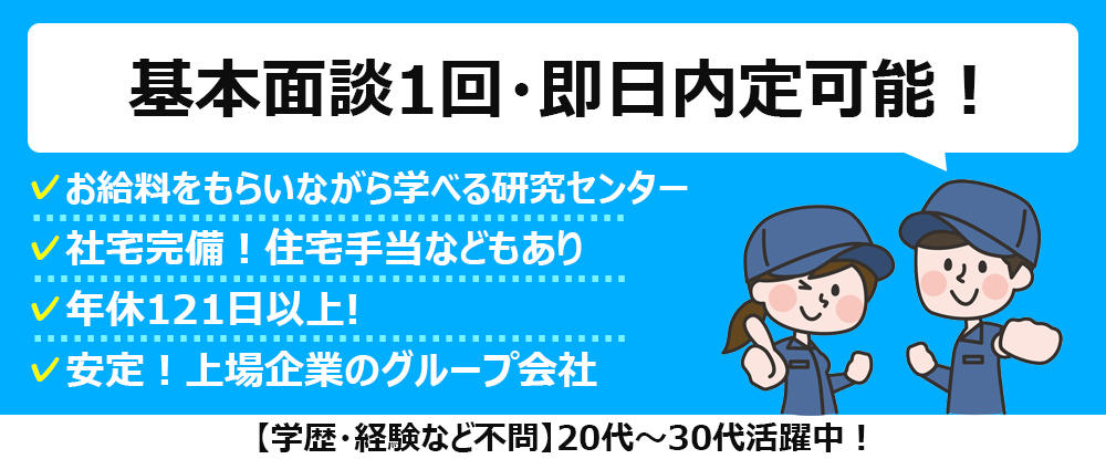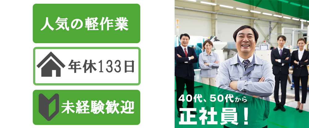今回の募集はリチウムイオン電池の製造に関わるお仕事です。 未経験で入社した20代〜50代の幅広い社員が活躍しています! 大手企業での勤務の為職場環境は充実。安心して勤務が出来ます。 研修が充実して...