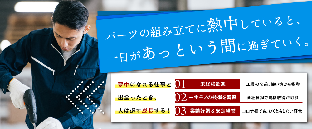 あなたの技術と熱意が、私たちの成長をさらに加速させる。 当社は金属加工の先駆者として、業界をリードし続けています。 ●月給30万円以上を保証! あなたの技術と努力に応じた報酬をお約束します。 ●...
